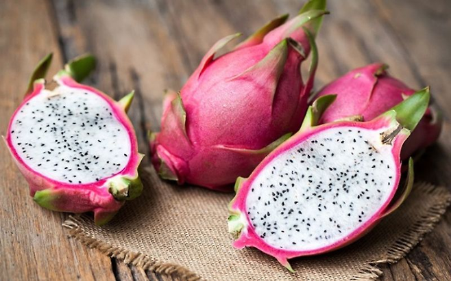 용과는 베트남의 대표적인 과일로, 두꺼운 자홍색 껍질과 작은 씨가 박힌 과육을 가지고 있습니다.