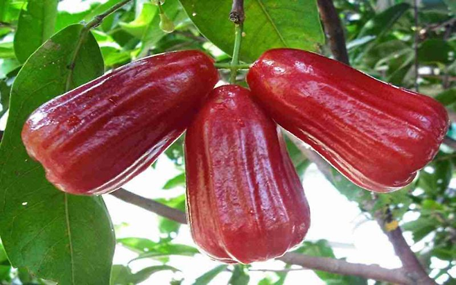 로즈 애플은 바삭하고 즙이 많은 과육을 가진 종 모양의 과일입니다.