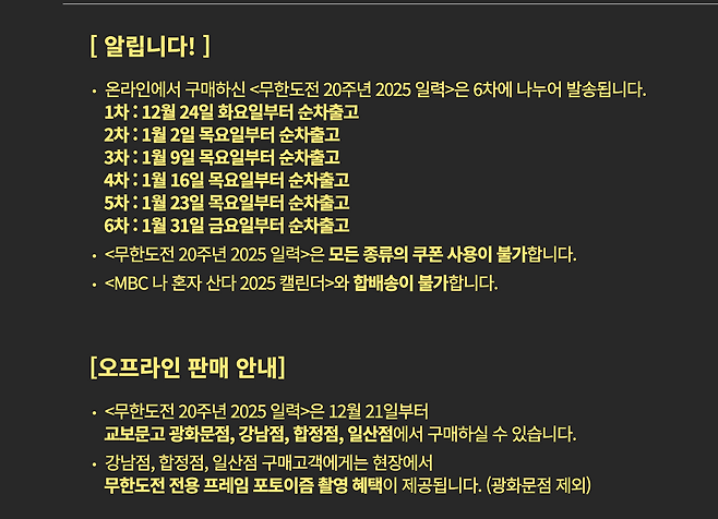 받는 시점이 다소 늦어도 크게 걱정하지 않으셔도 돼요. 1월부터 시작되는 달력이니, 1월 중순쯤 받아도 충분히 추억을 쌓을 수 있어요. 그래도 최대한 빨리 받아보고 싶다면 12월 21일부터 오프라인 매장에 직접 방문해보는 것을 추천드려요.