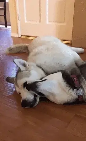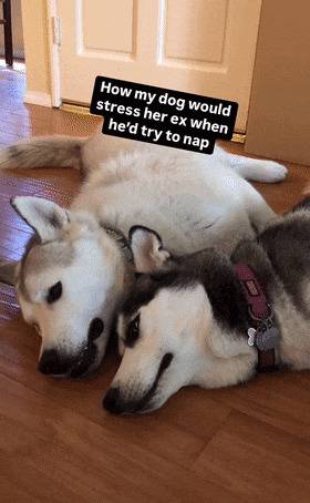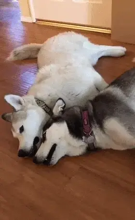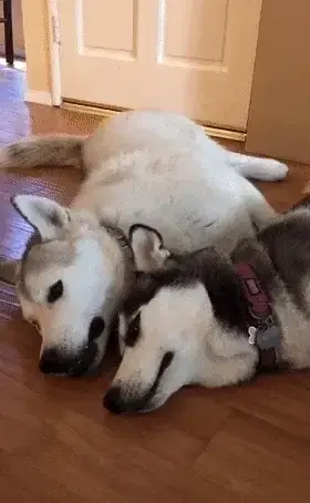 잠자리에 들려는 허스키. 하지만 다른 허스키는 함께 놀고 싶어, 강아지 옆에 누워 온갖 애교를 부립니다.