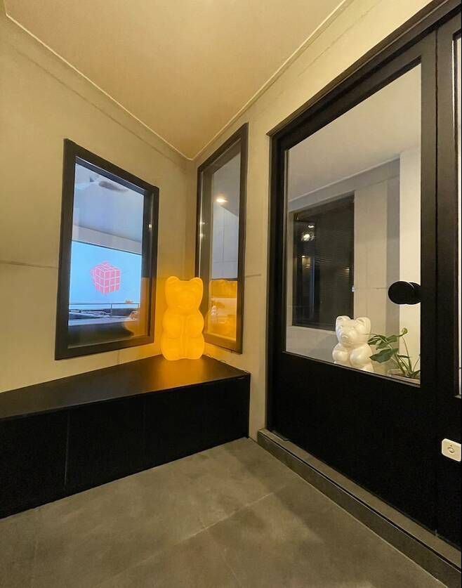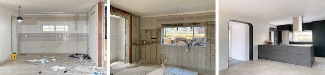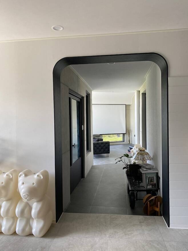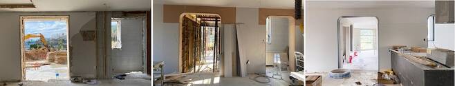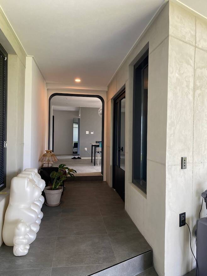 그리고 본동과 신축동 연결이 아주 기가 막혔어요. 기존 본동 거실에는 밖으로 나갈 수 있는 창이 두 개가 있었어요. 전면부에 하나 그리고 건물 좌측면으로 작게 하나가 있었는데 좌측면 쪽을 헐어서 신축동과 연결하는 복도가 만들어졌고 현관 입구도 그쪽으로 변경하게 되었어요.