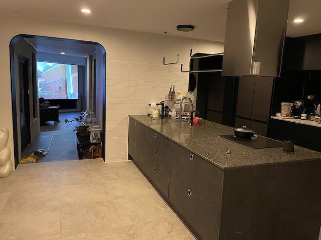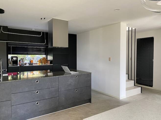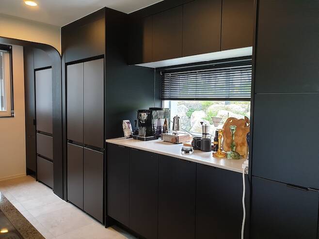 기존 건물은 거실과 주방이 있던 공간 전체를 주방과 다이닝룸 그리고 세탁실로 사용하기로 했어요. 11자 구조로 주방을 설계하고 아일랜드 상판을 엔지니어드 스톤으로, 싱크대 가구는 블랙을 선택하여 더 고급스러운 느낌을 줬어요.
