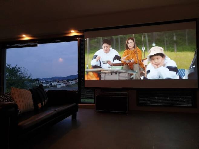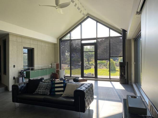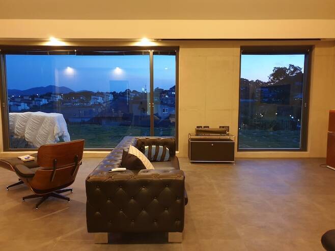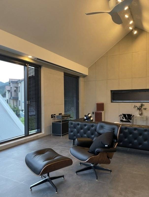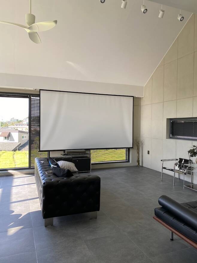 신축 거실은 16평에 박공지붕이고, 2중 로이코팅 유리로 뷰를 확보했어요. 빔으로 홈시네마를 즐기고 뷰를 바라보며 쉴 수 있는 힐링 공간을 생각하며 인테리어에 맞는 가구들을 선택했어요. 천장 박공은 도배로 했고, 그 외 벽은 노출 콘크리트 느낌으로 카페 분위기가 나도록 디자인을 잡았어요.