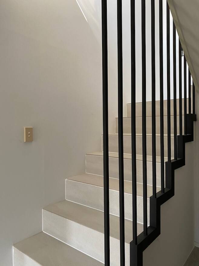 진짜 문제의 계단이에요. 타일 계단으로 바꿨는데 기존 계단 목작업이 수평수직이 맞지가 않아서 타일 작업하는데 꽤나 애를 먹었지만 너무 마음에 들어요. 난간 디자인도 그렇구요. 여담이지만 제가 키가 많이 크거든요. 제 키나 분위기에 어울리는 난간 디자인이라며 대표님이 추천해 주신 거예요.