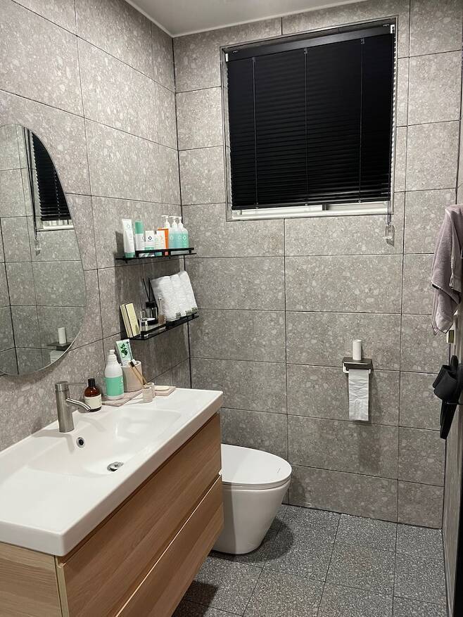 안방 화장실은 테라조 타일로 조적 욕조를 했어요. 원래 여닫이문이었는데 문 크기 너무 커서 열면 화장실이 작아 보여서 슬라이딩 도어로 선택했어요 :)