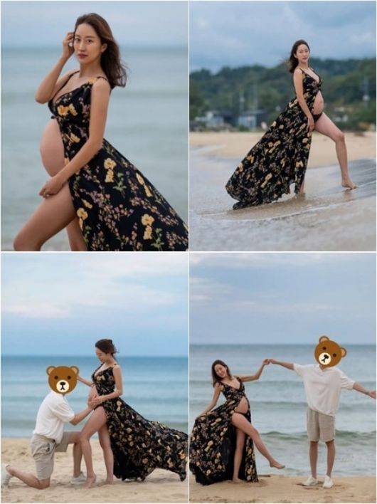 공개된 사진 속에는 전혜빈이 죽도 해변에서 만삭화보를 찍은 모습이 담겨 있다. 전혜빈은 D라인이 고스란히 드러나는 비키니에 롱드레스를 걸쳐 우아함을 살렸다. 특히 출산을 코앞에 둔 만삭이지만 군살이 전혀 없는 늘씬한 보디라인과 비주얼을 공개해 감탄을 자아냈다. 여기에 남편은 무릎을 꿇고 아내의 배를 어루만지는 등 애정을 표하기도 했다.