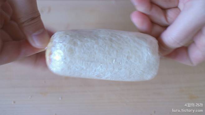 랩으로 단단히 감싸 고정한 뒤, 몇 분 정도 두었다가 조심스레 썰어주세요.