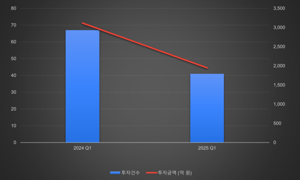 벤처투자 정보 플랫폼 더브이씨가 최근 공개한 '2025년 1분기 한국 스타트업 투자 통계'에 따르면 올해 1분기 AI 스타트업을 대상으로 이뤄진 투자는 41건으로 집계됐다. 이는 전년 동기(67건) 대비 39% 줄어든 수치다. 같은 기간 투자금 또한 1949억원에 그치며 37% 감소했다.