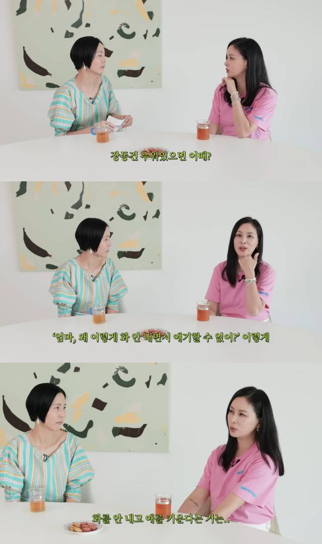 아이를 키우며 화를 내기도 하는지 묻자 "하루에도 화를 몇 번 내는지... 애들은 잘못한 거 없다, 어른이 잘못 키우는 거다, 이 말은 맞는 거 같다. 그리고 매일 똑같은 잔소리를 하게 된다. 매일 똑같은 얘기를 15년 동안 하니까 애들이 엄마 화 좀 내지 말라고 한다. 화를 안 내고 애를 키우라는 건 애를 안 키워본 사람인 것 같다"고 했다.