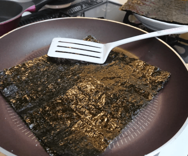 오래된 김은 수분을 먹고 눅눅해진 경우가 많다. 하지만 이 김을 후라이팬에 구워주면 다시 바삭한 식감을 되살릴 수 있다. 가장 중요한 포인트는 ‘푸른빛’이 돌 때까지 약한 불에서 천천히 구워주는 것이다. 김이 탈 듯 말 듯할 정도로 구워졌을 때 특유의 감칠맛이 살아난다.