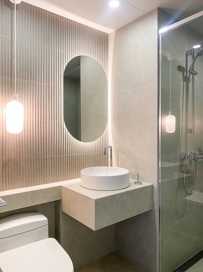 비슷한 평형대에서 볼 수 있는 일반적인 구조의 화장실이지만 욕실에 들어올 때마다 여행지 리조트에서 경험했던 쾌적함과 고급스러움을 느끼고 싶었는데 그런 바람을 이룬 것이 바로 안방 욕실이에요. 덩그러니 세면볼만 있는 일반적인 아파트 화장실이 아니라 호텔에서 종종 보았던 탑볼세면대 디자인을 적용해봤습니다. 참 많은 공정이 필요하고 적지 않은 비용이 드는 공사였지만 볼 때마다 뿌듯한 공간이에요.