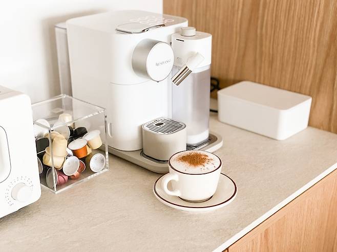 냉장고에서 식재료를 꺼내면 맞은편의 싱크볼 옆으로, 세척과 손질이 끝나면 싱크볼과 쿡탑 사이 조리공간에서 준비하고 인덕션으로, 요리를 마치면 식탁으로 음식이 이동하는 완벽한 동선! 더불어 커피머신과 소형 주방가전을 올려놓을 수 있는 홈 카페 공간도 따로 구성하였어요.