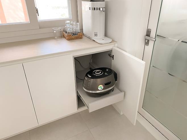 그 외에도 수납 편의를 위해 작은 것까지 신경을 많이 쓴 주방이랍니다. 밥솥은 밥을 지을 때만 꺼내어 사용하고 그때그때 남은 밥은 냉장고에 얼려두기 때문에 항시 보이는 오픈 수납장이 아닌 도어 타입의 장 안에 보관하고 있어요.