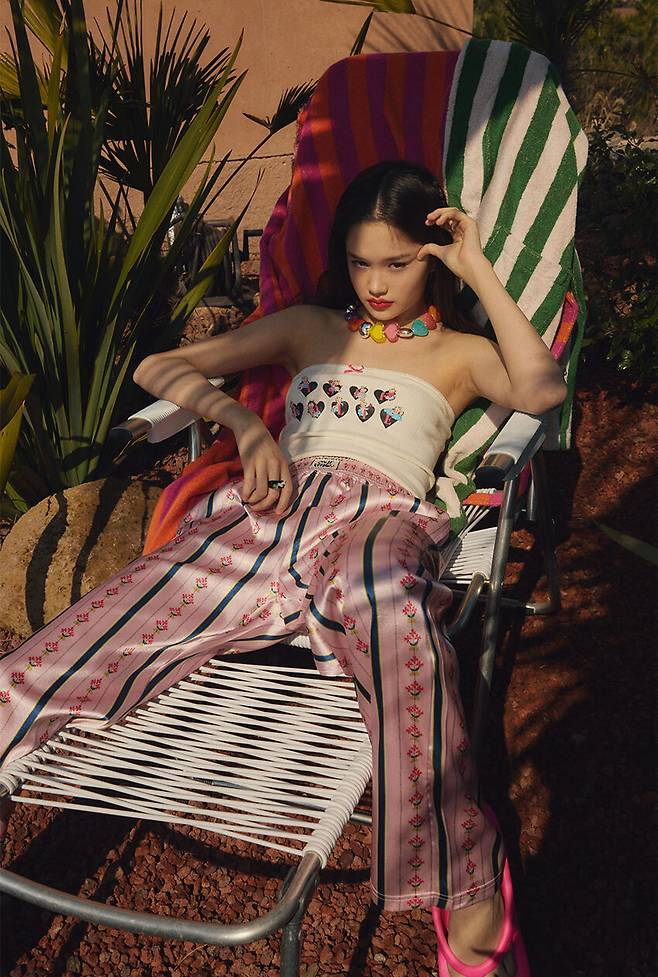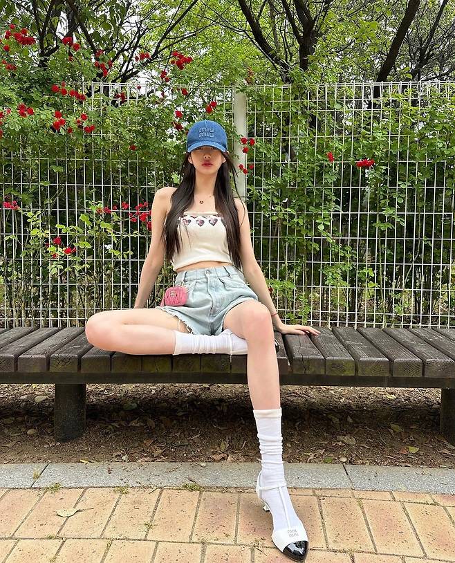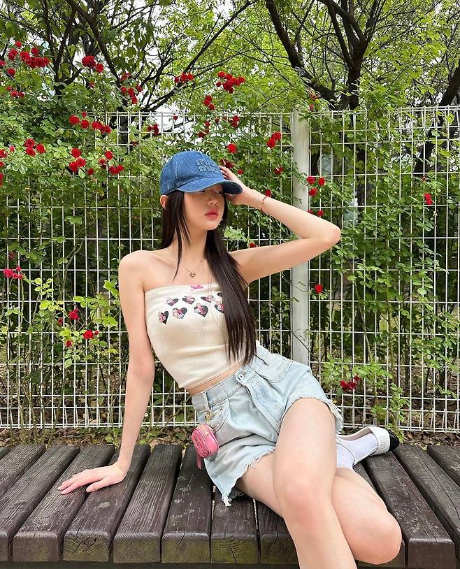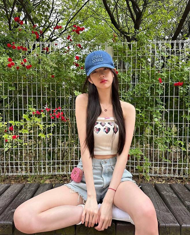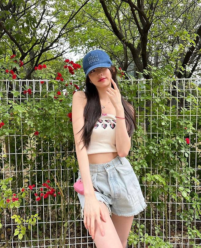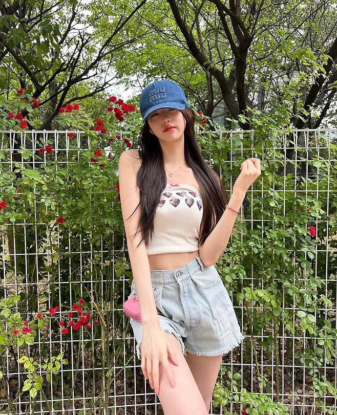 장원영은 그래픽 탱크탑과 핫팬츠를 매치했습니다.