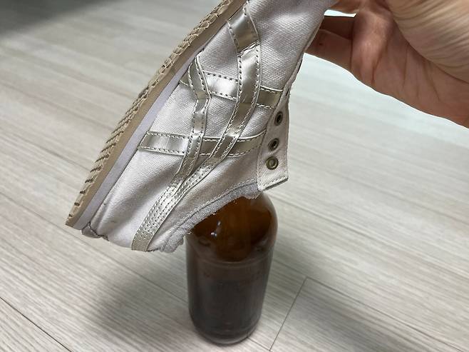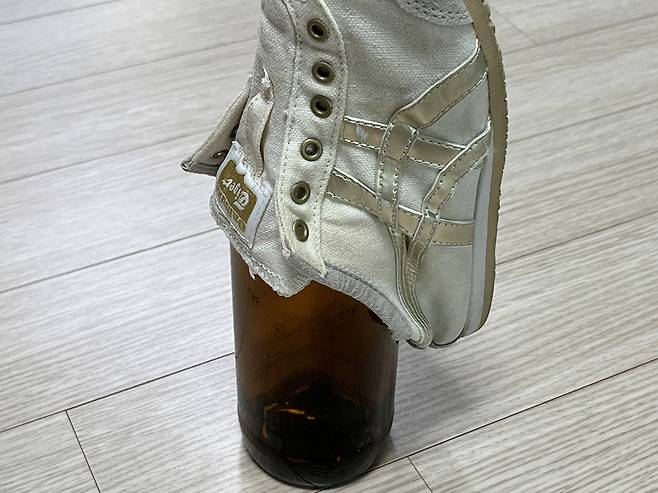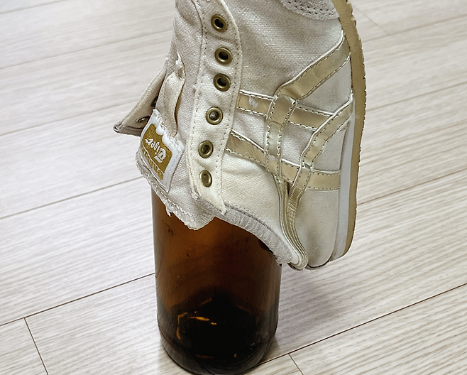 혹은 맥주병 등 유리병을 활용할 수도 있습니다. 물기 없이 마른 맥주병을 준비한 다음 운동화를 그 위에 끼워서 말려 보세요.