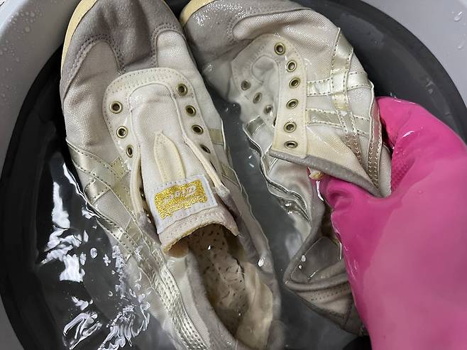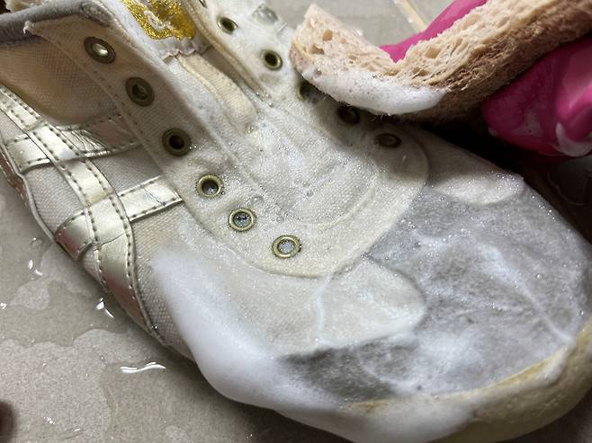 미지근한 물에 5~10분 담가서 운동화의 때를 불리세요. 그리고 세제는 주방세제나 샴푸 등을 사용합니다.
