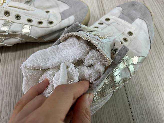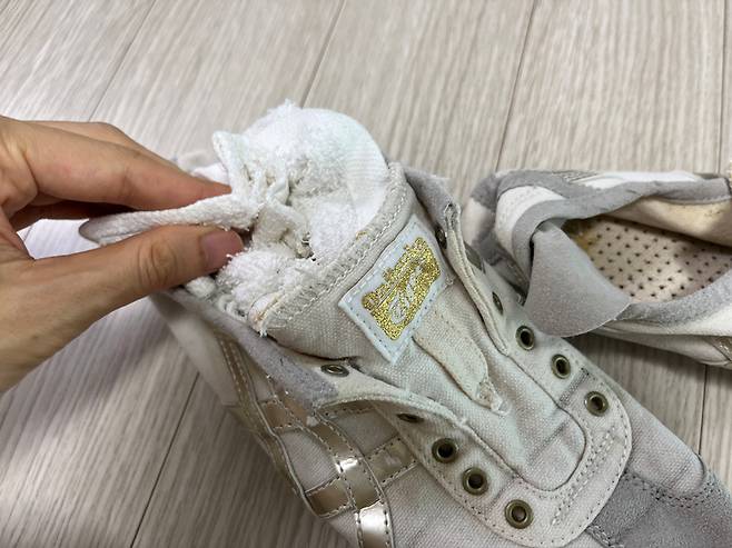 운동화는 형태를 잡는 것이 중요한데요. 물기 제거한 운동화 안에 마른 수건이나 키친타월 등을 구겨 넣어서 모양을 보존해 주세요.