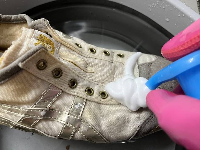 의류 세탁도 마찬가지이지만, 운동화 세탁도 잔여 세제가 없도록 충분히 헹궈주는 것이 중요합니다.