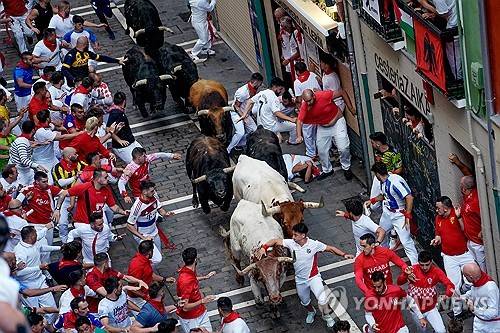 epa11469755 Several 'mozos', or runners, are chased by bulls of Fuente Ymbro ranch during the fourth 'encierro' or running of the bulls of the San Fermin festival in Pamplona, northern Spain, 10 July 2024. The San Fermin festival (locally known as 'sanfermines') runs from 06 to 14 July, with the running of the bulls as the main events. EPA/AINHOA TEJERINA