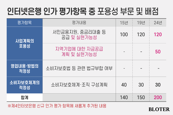 금융위는 "포용 금융에 기반한 지속가능성이 중점 심사 대상"이라며 "사업계획의 포용성 평가를 강화"했다고 밝혔다. 평가점수 총 1000점 가운데 자본금 및 자금조달방안은 배점 150점, 포용성은 200점이다. 포용 금융은 어떤 개인이나 기업이든 금융상품과 서비스에 편리하게 접근 가능하게 하는 개념이다.