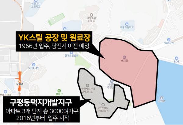 하지만 2014년 LH가 요청한 구평동택지개발지구 변경 계획을 부산시가 승인하면서 아파트 개발은 예정대로 진행됐다. 현재 YK스틸 공장 반경 약 700m 안에 ‘사하e편한세상’, ‘사하구평지구 중흥S클래스’ 등 아파트 6개 단지, 총 3700여가구가 입주해있는 상황이다.
