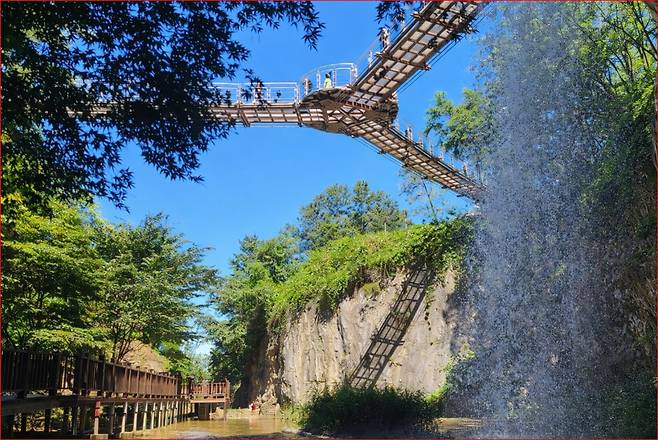 다리의 중앙부(접합점)는 이곳의 하이라이트 포토존으로, 깎아지른 듯한 암벽을 타고 흐르는 물줄기를 배경으로 인생샷을 남기기에 최적의 장소입니다. 2월인 지금은 기온에 따라 폭포 가동 여부가 결정되지만, 폭포가 잠시 멈춘 시간에도 도덕산의 거친 암반과 은빛 다리가 만들어내는 기하학적인 조화는 방문객들의 시선을 사로잡기에 충분합니다.