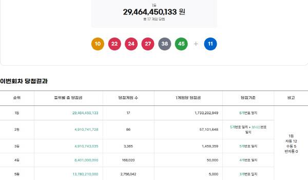 로또복권 운영사 동행복권은 17일 이 같은 내용의 추첨 결과를 발표했다. 당첨번호 6개를 모두 맞힌 1등 당첨자는 17명으로 각 17억 3320만 원씩 받는다.