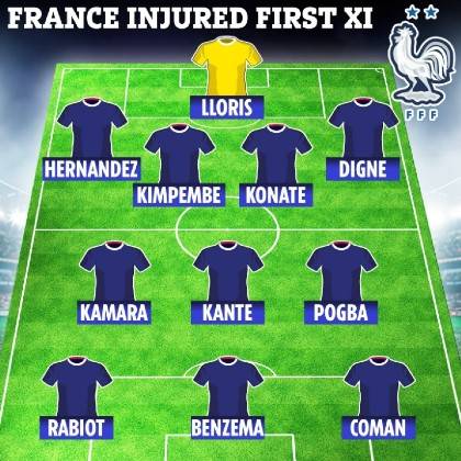 프랑스의 부상 선수 베스트11 공격진에는 벤제마(레알 마드리드)와 함께 코망(바이에른 뮌헨)과 라비오(유벤투스)가 선정됐다. 또한 미드필더진에는 포그바(유벤투스), 캉테(첼시), 카마라(아스톤 빌라)가 이름을 올렸고 수비진에는 디뉴(아스톤 빌라), 코나테(리버풀), 킴펨베(파리생제르망), 에르난데스(AC밀란)가 포함됐다. 골키퍼에는 요리스(토트넘)가 선정됐다.