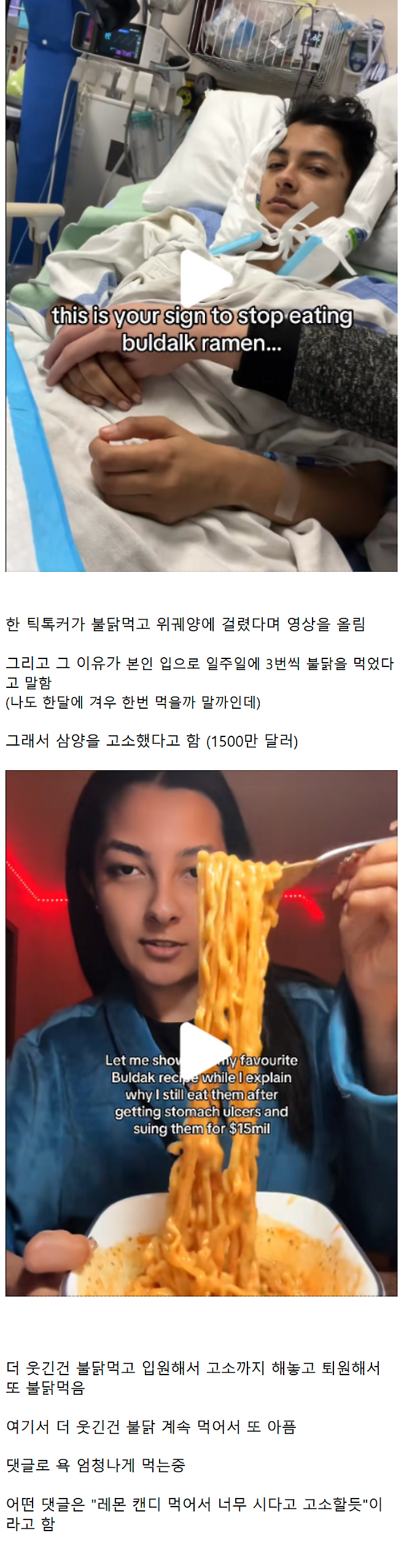 불닭 볶음면 먹고 병원 입원해서 난리난 서양 여성