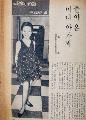 1960년대 미니스커트를 유행시킨 대중문화의 아이콘. 6세 때 뮤지컬 '크리스마스 선물’을 통해 배우로 데뷔했으며, 1967년 '웃는 얼굴 다정해도’라는 곡을 발표하면서 미니스커트 붐을 일으켰다. 여성의 짧은 치마를 금기시하던 당시 풍조에서 윤복희의 미니스커트는 단순한 의복이 아닌 자유의 상징이었다. '여성동아’는 1968년 6월호에 하와이, 뉴욕, 시카고, 라스베이거스 등 미국 투어를 마치고 1년 만에 돌아온 윤복희 기사를 게재했는데, 텍사스에서는 재즈 가수이자 트럼펫 연주자인 루이 암스트롱과 TV쇼에 출연해 호평을 받았다고. 특히 '여성동아’는 당시 윤복희에 대해 "독특한 바이브레이션과 보사노바 창법이 매력적이며, 얼굴 표정과 몸의 움직임이 크다. 덕분에 듣는 음악에서 보는 음악으로 확장시켰으며, 신세대의 호응이 크다"고 분석했다. 윤복희는 인터뷰에서 "혼신의 힘을 다해 무대에 서기 때문에 공연이 끝나면 마라톤 경주를 한 것처럼 탈진한다"고 밝혔다. 미니스커트에 대해선 "미국 여성들이 모두 입어서 따라 한 것일 뿐"이라고 시크하게 말했다.
