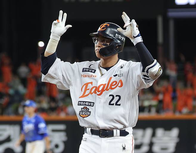| ▲ 24일 대전한화생명볼파크에서 열린 2025 프로야구 KBO리그 포스트시즌 플레이오프 5차전 삼성 라이온즈와 한화 이글스의 경기. 5회말 무사 2,3루 상황에서 한화 채은성이 2타점 적시타를 친 뒤 세리머니를 하고 있다. |