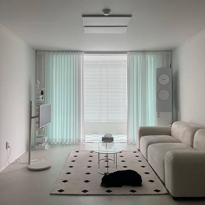 1인 가구의 효율성을 위해 TV 대신 lg 스탠바이미를 선택했고요, 소파와 북 선반 테이블, 카펫, 청소기까지 모두 오늘의집에서 구매했답니다.☺️