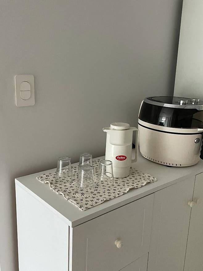 싱크대 뒤편에는 냉장고와 옆에 작은 수납장을 뒀고 그 위에 에어프라이기와 물병과 물잔을 뒀어요!