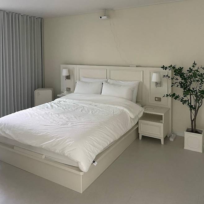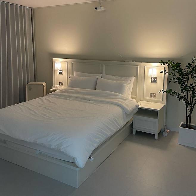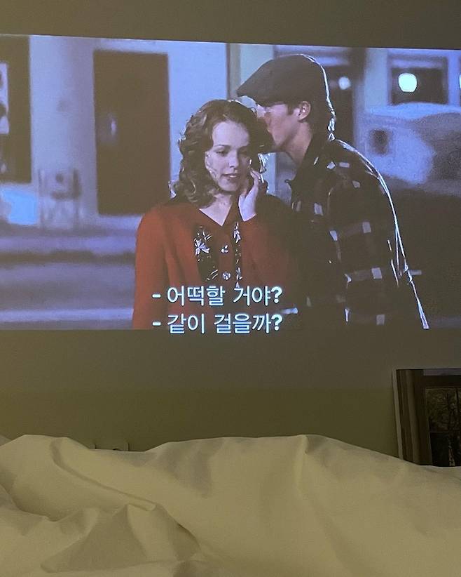 천장에는 미니 빔을 설치해서 이렇게 침대에서 빔을 볼 수 있어요. 너무 편하고 힐링 되는 저의 휴식 공간이 되었답니다. 🎞🤍