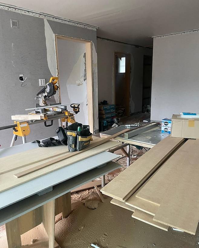 두 번째 과정은 목작업이었어요. 처음 리모델링을 알아보면서 꼭 하고 싶었던 게 9mm 문선이었어요! 9미리 문선을 위해 문을 모두 뜯어냈고 두꺼운 몰딩과 걸레받이를 마이너스 몰딩과 6전 걸레받이로 바꾸기 위해 목수님을 섭외해서 시공을 했답니다.