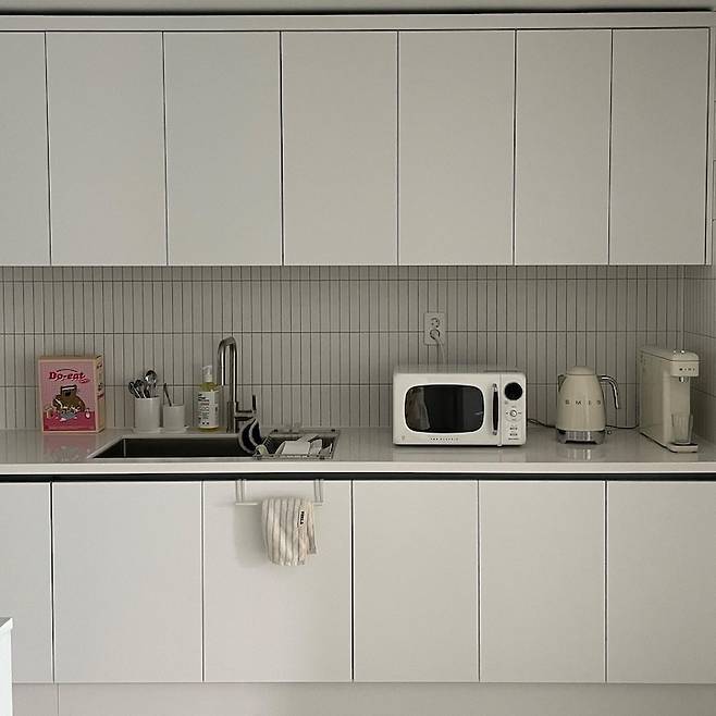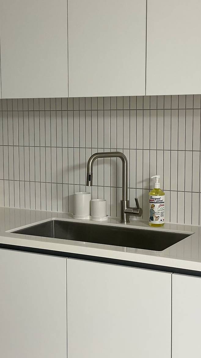 타일은 예전부터 하고 싶었던 피아노 타일로 고민 없이 선택했는데 유광, 무광 고민하다 싱크대에 맞춰 무광으로! 싱크대 상부장은 천장에 딱 붙여서 보통 실리콘을 쏘는데 실리콘은 시간이 지나면 변색이 생기는 거 같아서 저는 공간을 조금 떼고 설치했는데 아주 만족하고 있어요 :)