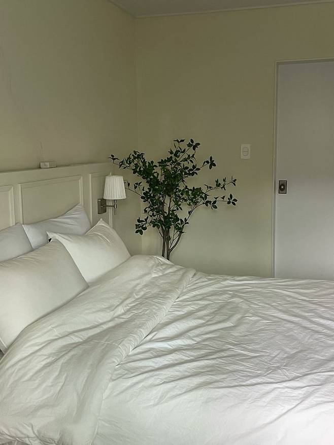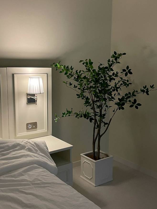 침대 옆 빈 공간에는 조화 화분을 뒀는데 다들 진짜인 줄 알아요. 밋밋했던 벽에 식물로 컬러감을 줬어요!