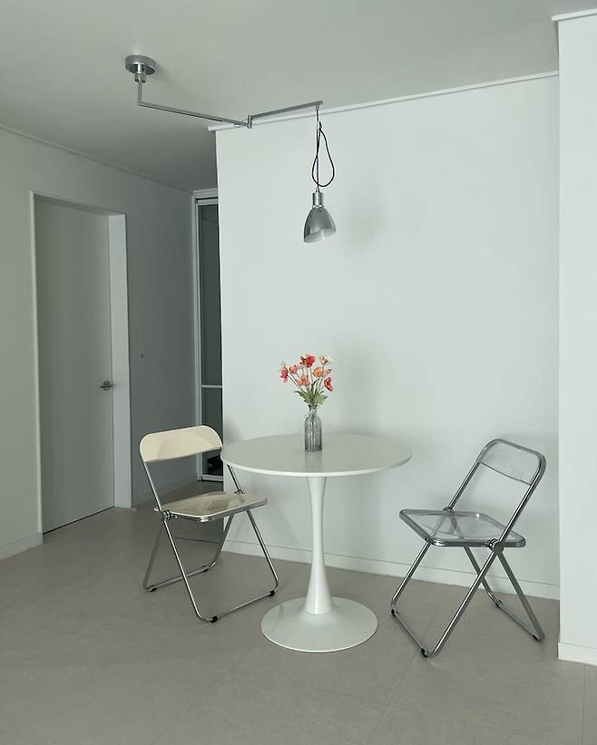아직 구조상 식탁을 둘 곳은 여기뿐이라 이곳에 작은 식탁과 의자를 뒀어요. 천장에 식탁등 위치도 애매해서 조명을 많이 고민하다가 찾게 된 조명인데 원래는 갓이 메탈이 아니고 유리인데 너무 무거워서 천장에 보강을 하고 달기로 하고 임시로 메탈 갓을 씌워놨는데 은근 어울려서 우선 저렇게 사용하고 있어요.💡