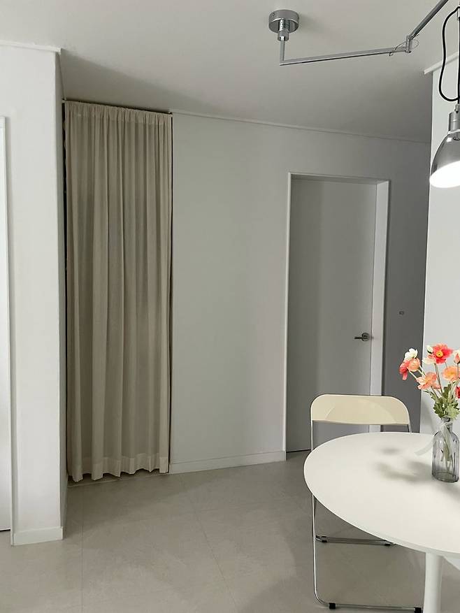 식탁 뒤쪽에는 장은 방 문과 벽에 공간이 있었는데 선반을 설치해서 펜트리로 사용하고 있고 문 설치 대신 리넨 커튼으로 가려뒀어요! 화이트 톤에 베이지 리넨이 들어가니 조금 따뜻한 느낌이 들어서 좋아요 :)