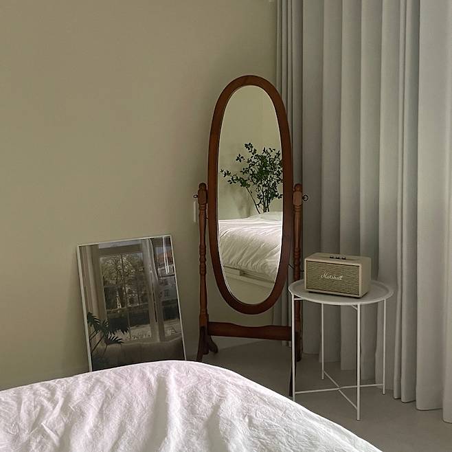 침대 앞 공간에는 톤 다운된 우드 거울로 한 톤 눌러줬어요. 벽지랑 우드 색감이 잘 맞아서 잘 어울리더라고요.