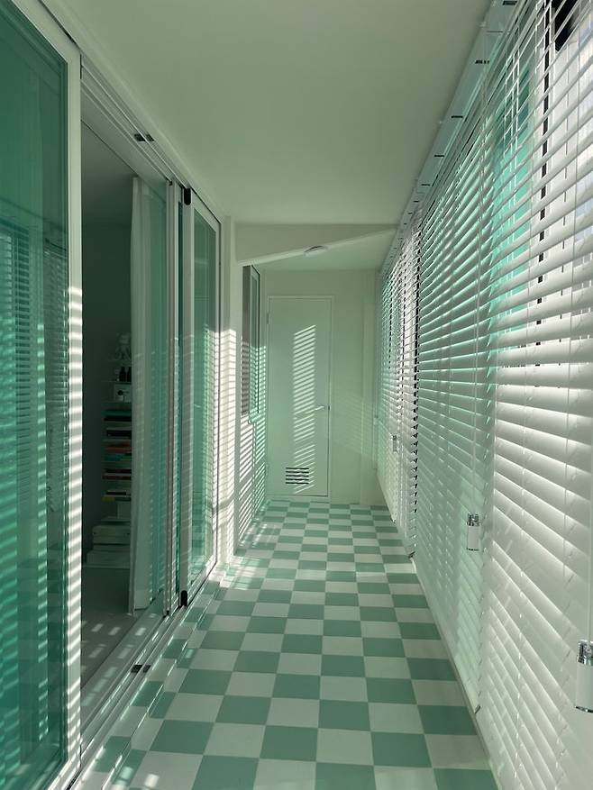 베란다 타일은 처음에는 무난한 그레이 톤으로 하려고 했다가 포인트를 주고 싶어서 고민 끝에 선택하게 된 200각 컬러 타일! 민트, 화이트 컬러로 체커보드 모양으로 붙였는데 아주 만족하고 있어요! 섀시 유리도 초록빛이 돌아서 너무 잘 어울려서 아주 만족하고 있답니다.