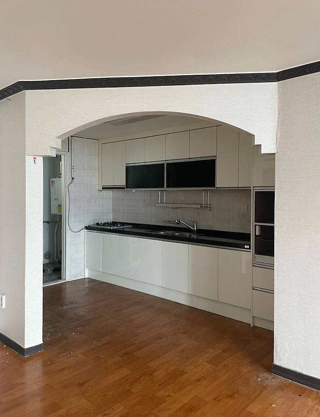 싱크대에는 키큰장이 있었고 입구에는 아치형 가벽이 설치되어 있던 주방이었어요. 요즘 유행하는 아치와는 느낌이 다른 예전에 유행했던 인테리어래요!