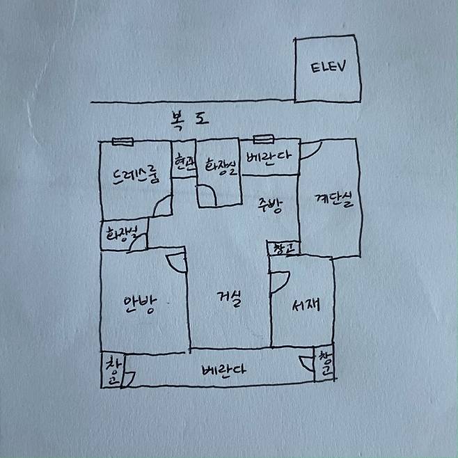 한 층에 4집이 사는 창문 달린 복도식 구축 아파트에요. (구축이라 도면을 인터넷에서는 찾을 수가 없어서 제가 그려봤는데요. 미술과는 거리가 먼 저의 똥손 이해해 주세요.) 😂 구조는 방 3, 화장실 2, 구축의 특징 베란다가 크게 있는 구조의 31평 아파트예요. 아무래도 복도식이기 때문에 요즘 볼 수 있는 그런 구조는 아닌 조금 특이한 구조였답니다.