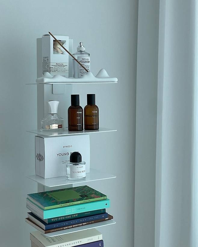 선반 위층에는 자주 쓰는 좋아하는 향수를 진열해뒀는데 인테리어 소품처럼 예쁘게 진열되어서 마음에 들어요.😌