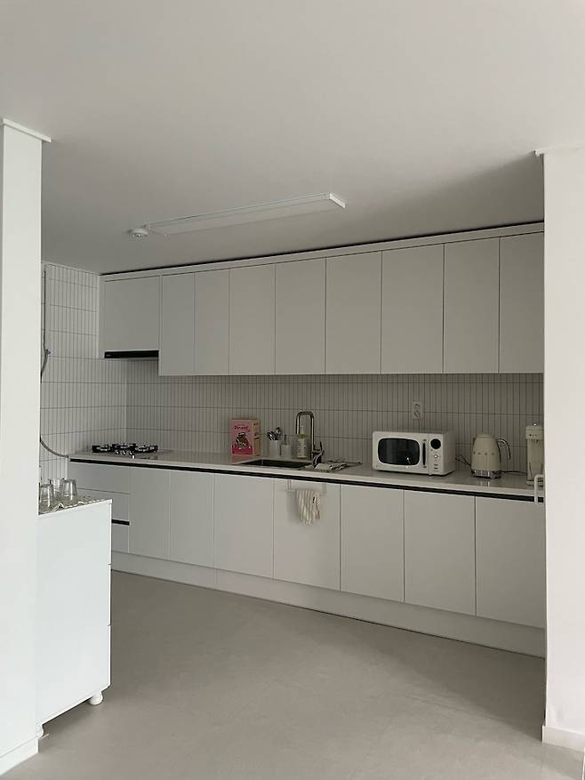 아치형 가벽을 없애고 싱크대 키큰장도 없애고 일자로 쭉 뺐어요. 그래서 주방이 더 길고 넓어 보여요! 전체 무광 화이트에 상판도 화이트톤으로 선택했어요.