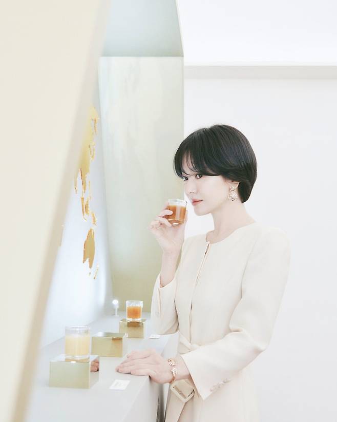 마지막 사진에서 송혜교는 크림색 원피스를 착용하며 세련된 우아함을 연출하고 있다. 허리 라인을 강조한 디자인과 깔끔한 노카라 디테일은 그녀의 고급스러운 이미지를 돋보이게 한다. 여기에 골드 액세서리와 팔찌를 매치해 전체적인 룩에 화려함을 더했다. 차분한 컬러감이 돋보이는 이 스타일은 격식 있는 자리에서 빛을 발할 수 있는 선택이다.