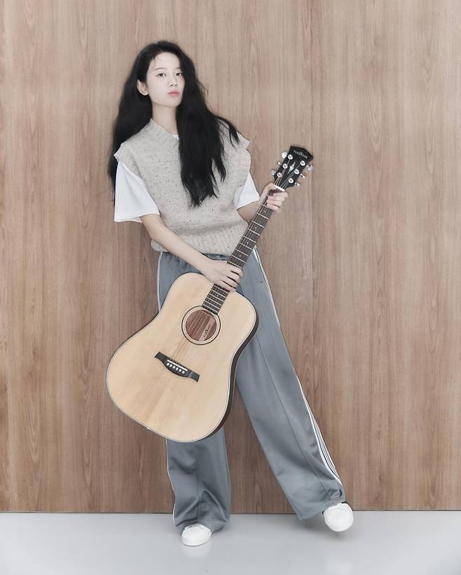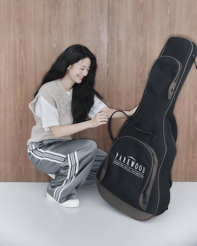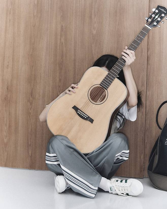 기타를 안고 선 모습에서도, 바닥에 앉아 웃는 모습에서도 이 조합은 흐트러짐 없이 안정적이에요.