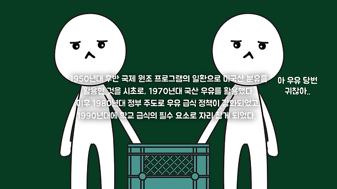 우유 급식을 받아본 적이 있으신가요? 성장기인 아이들에게 풍부한 영양소를 효율적으로 제공한다는 목적으로 시작된 사업입니다. 현재는 희망 학생에 한하여 선택적으로 실시하고 있다고 하는데, 옛날에는 반강제적으로 우유 급식을 하던 때가 있었습니다.
