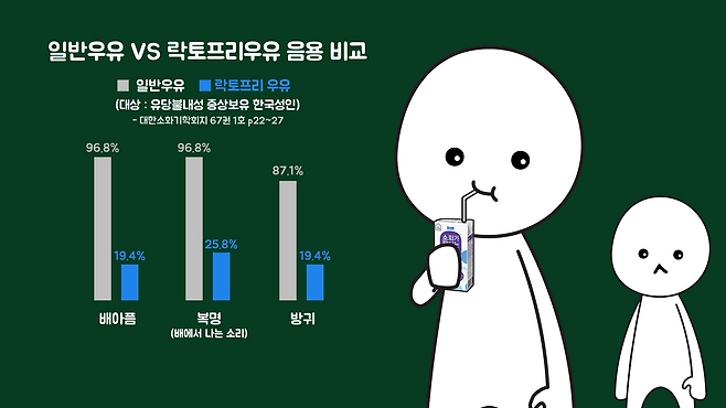 이와 관련해서 정말 괜찮은지 테스트를 한 적이 있는데, 데이터를 보면 영양에서는 일반 우유와 큰 차이가 없었고, 복통 등의 증상도 우유와 무관하게 일반적으로 음식 먹을 때 나타나는 소화기 반응에 가깝게 개선됐음을 확인할 수 있었습니다.