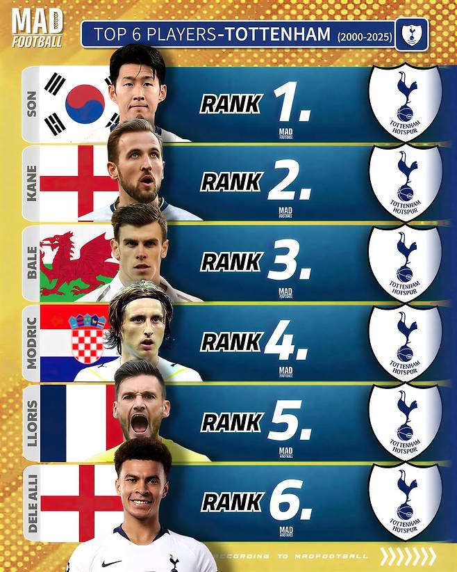 축구 콘텐츠 매체 매드풋볼은 10일(한국시간) 2000년부터 2025년까지 토트넘을 대표하는 상위 6명의 선수를 선정해 발표했다.